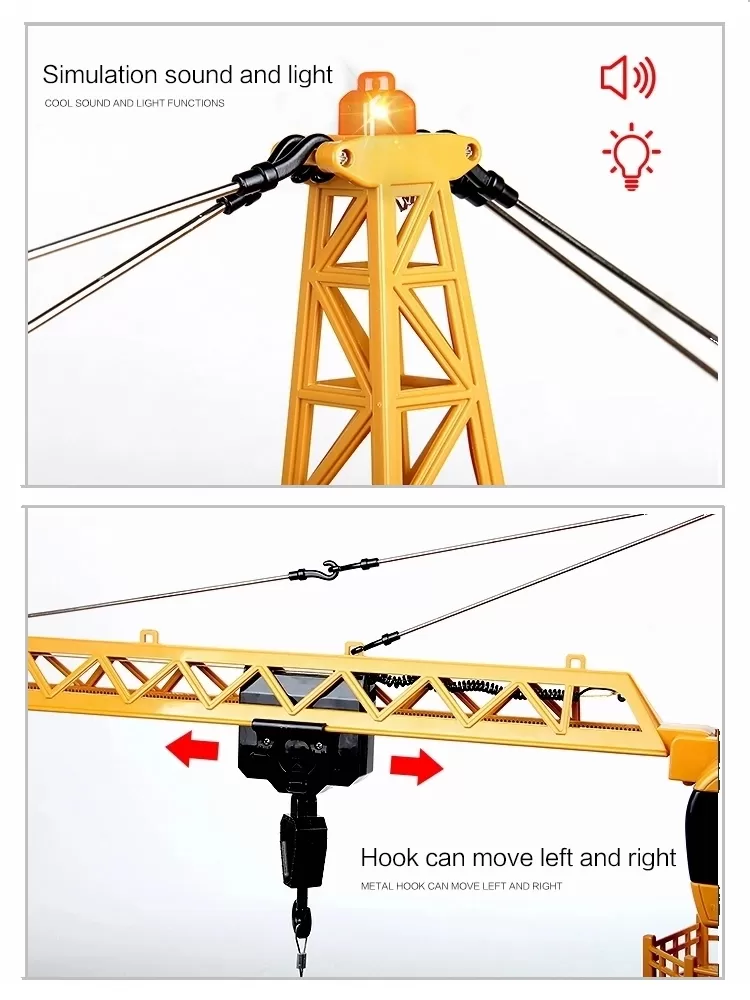 Functions | rise/fall, turn left/right, rotate,tower crane arm turn left, rotate,tower crane arm turn right, hook left shift, hook right shift, hook up and down |